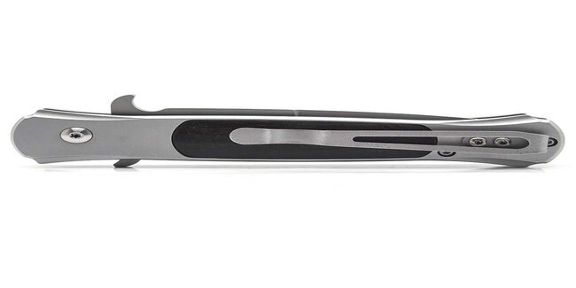 Avec ses 148 g, il est léger et compact, ce qui le rend très agréable à porter en EDC. Les plaquettes de manche en acier inoxydable avec incrustations en bois apportent à la fois durabilité, confort et une esthétique soignée. Le clip de poche de type tip‑up assure un port discret.